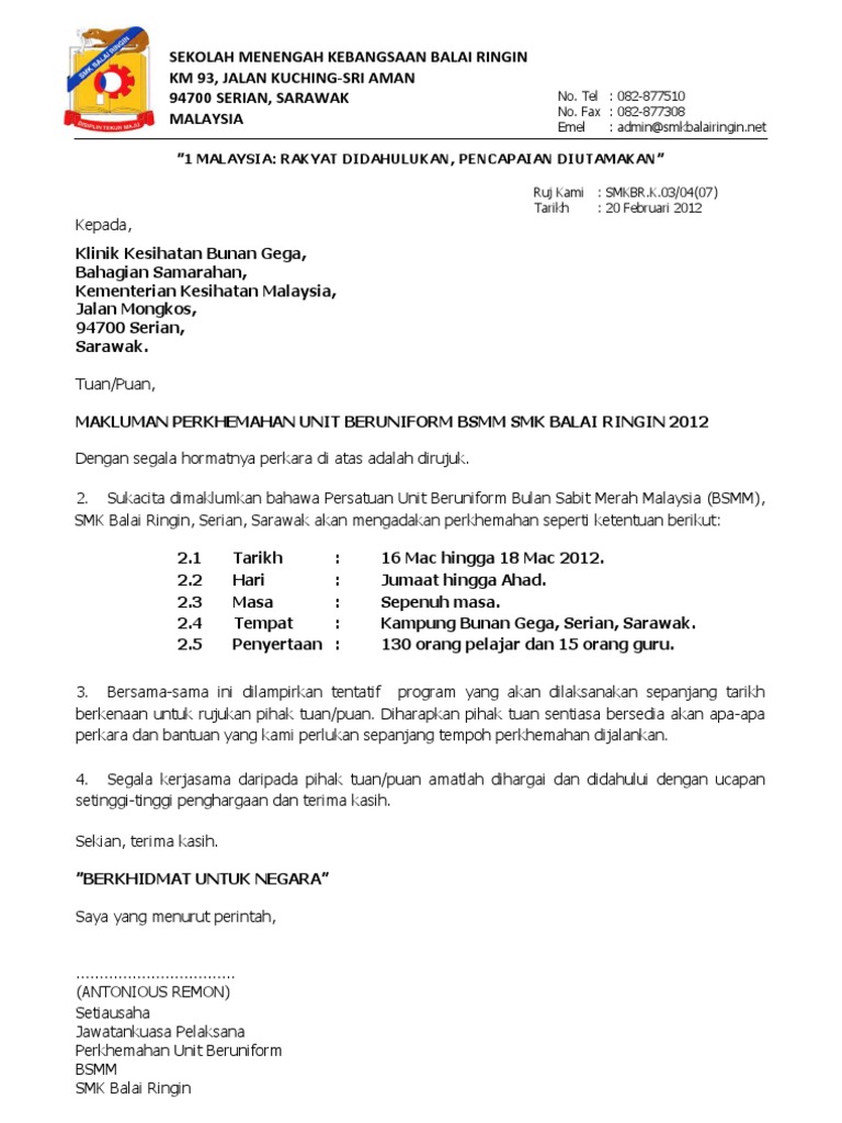 Memohon kebenaran ibu bapa penjaga Pejabat Pelajaran Daerah Jabatan Pelajaran Negeri untuk melaksanakan perkhemahan. Surat kiriman rasmi seperti surat tidak hadir ke sekolah adalah perutusan surat yang formal biasanya ia ditulis oleh individu atau sekumpulan individu yang mempunyai tujuan atau hasrat yang sama dan ditujukan kepada individu pertubuhan institusi kementerian badan berkanun atau jabatan kerajaan atau swasta yang berkenaan di mana pengirim tidak mengenali identiti. Surat Pelaksanaan KWAPM -APB.